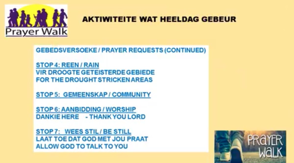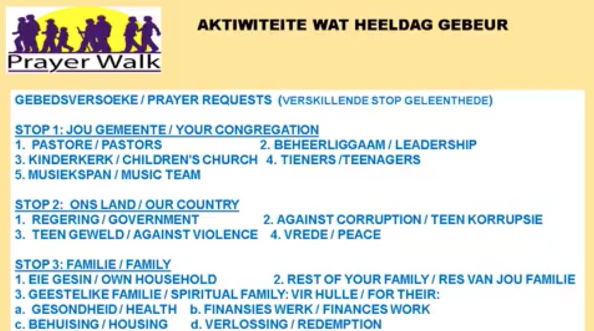 Op Bestemmings Sondae of op ander tye kan mens die gebedsroete stap. Nou kan u ook gedurende die week intree in gebed Vir die volgende onderwerpe:
